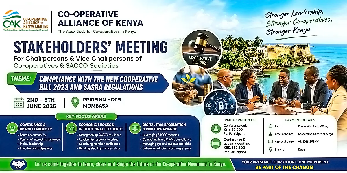 CAK is the National Apex Organization for Kenya's Co-operative Movement. Its membership is drawn from over 25,000 registered Co-operatives that include the National Co-operative Organizations (NACOs), Co-operative Unions and Primary Co-operative Societies. The individual members to these Co-operatives are over 14 million with mobilized savings of over Kshs. 250 billion or 30% of National Savings. Those employed in the sector are over 555,000 persons.